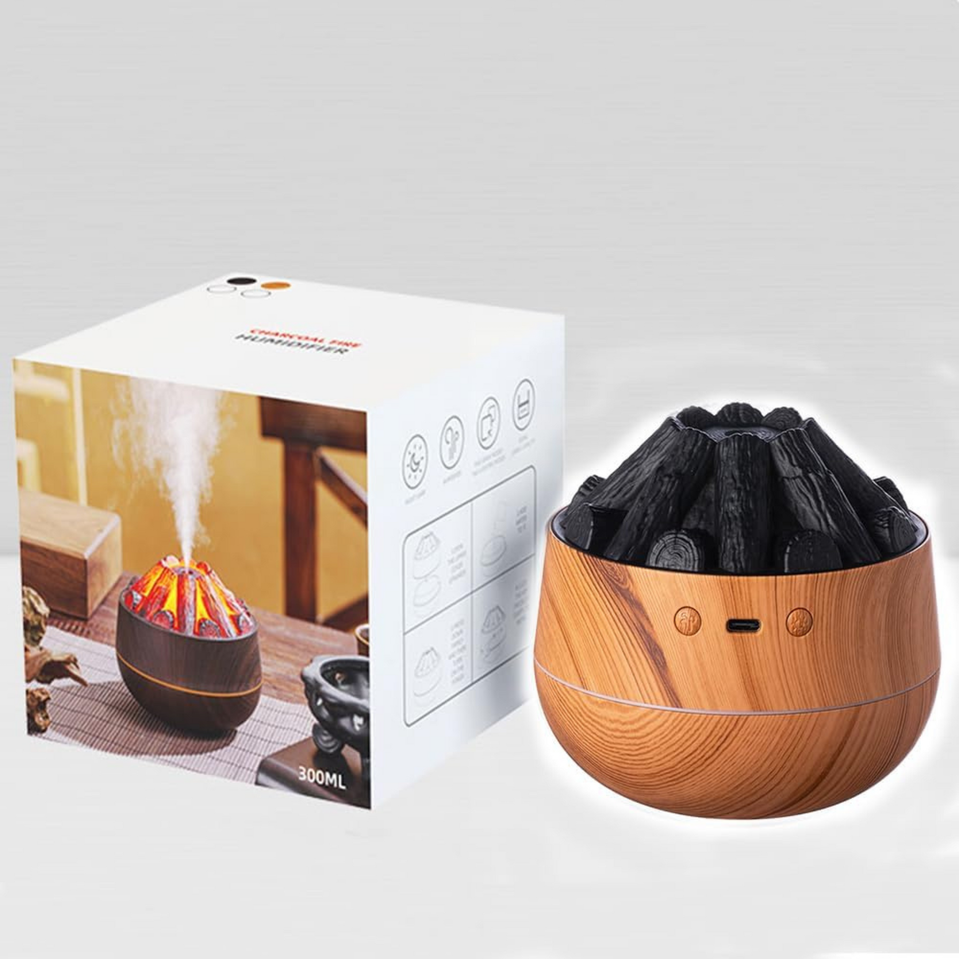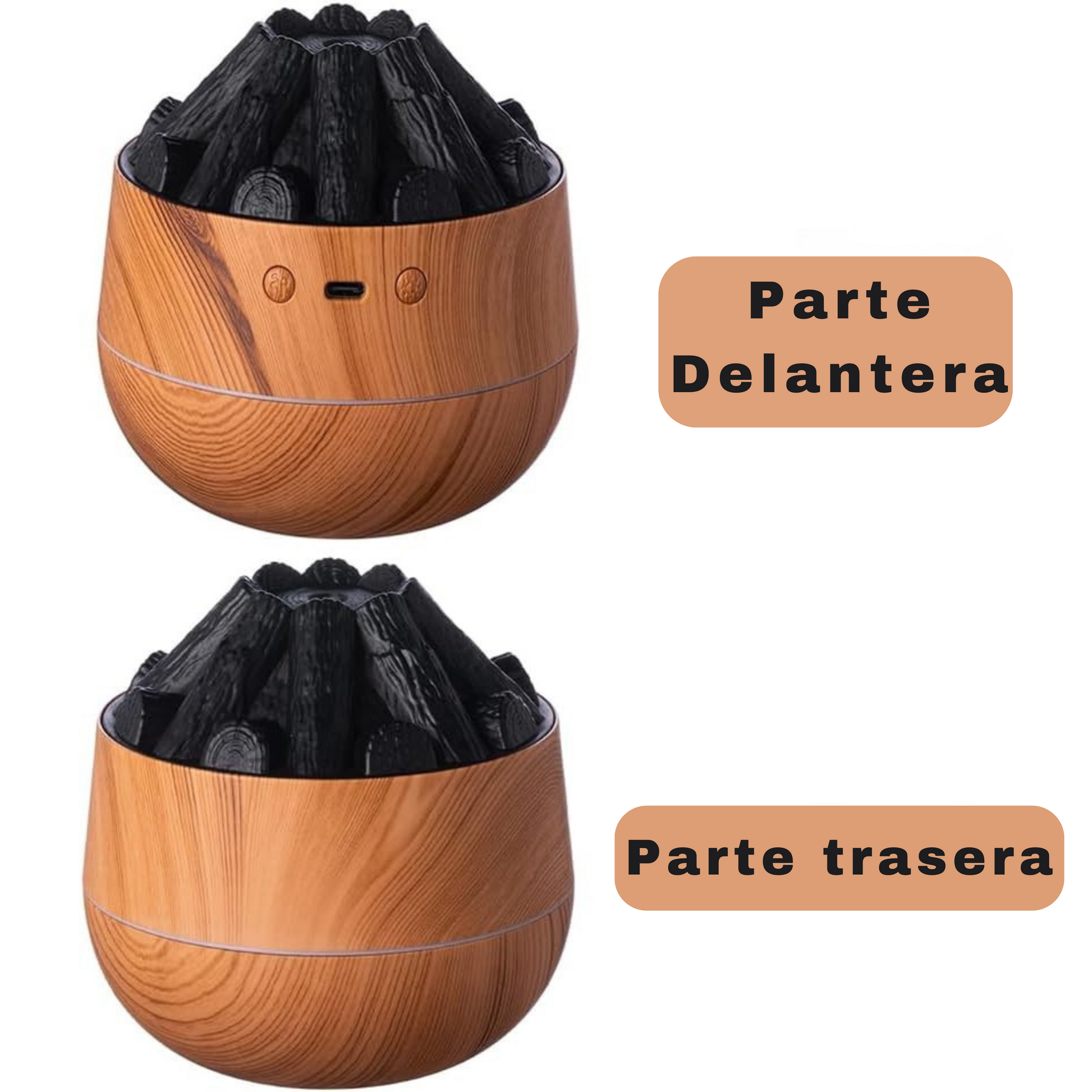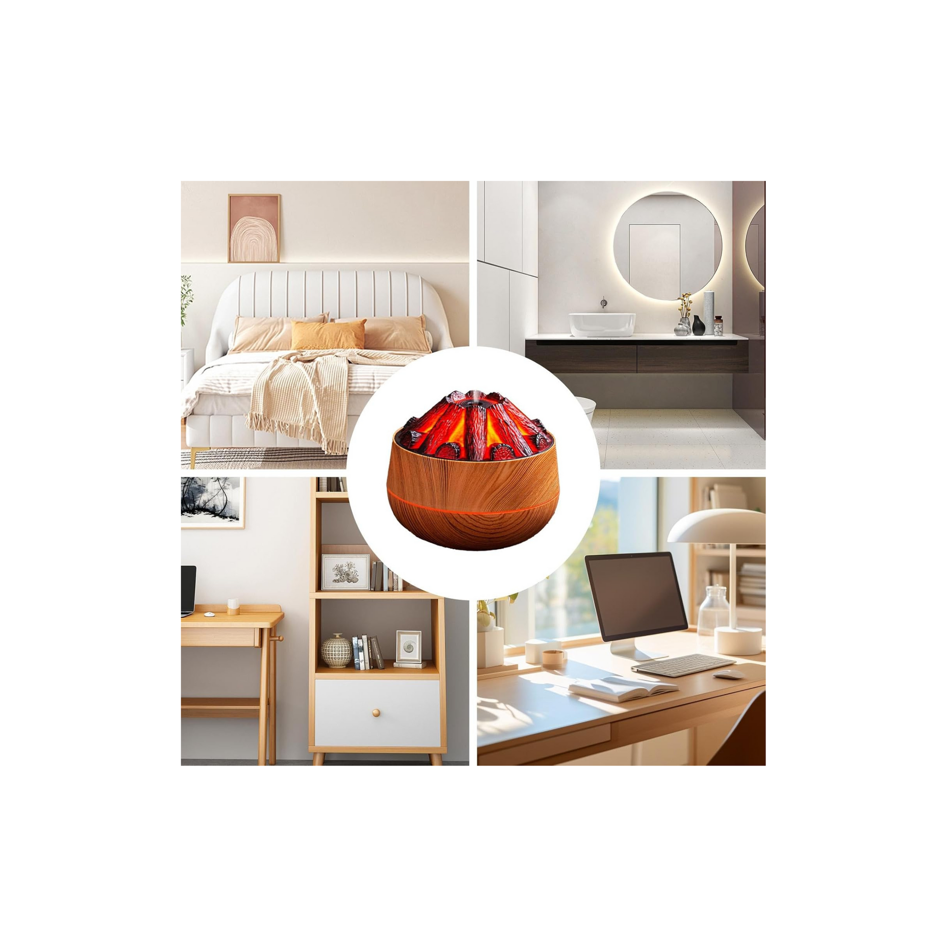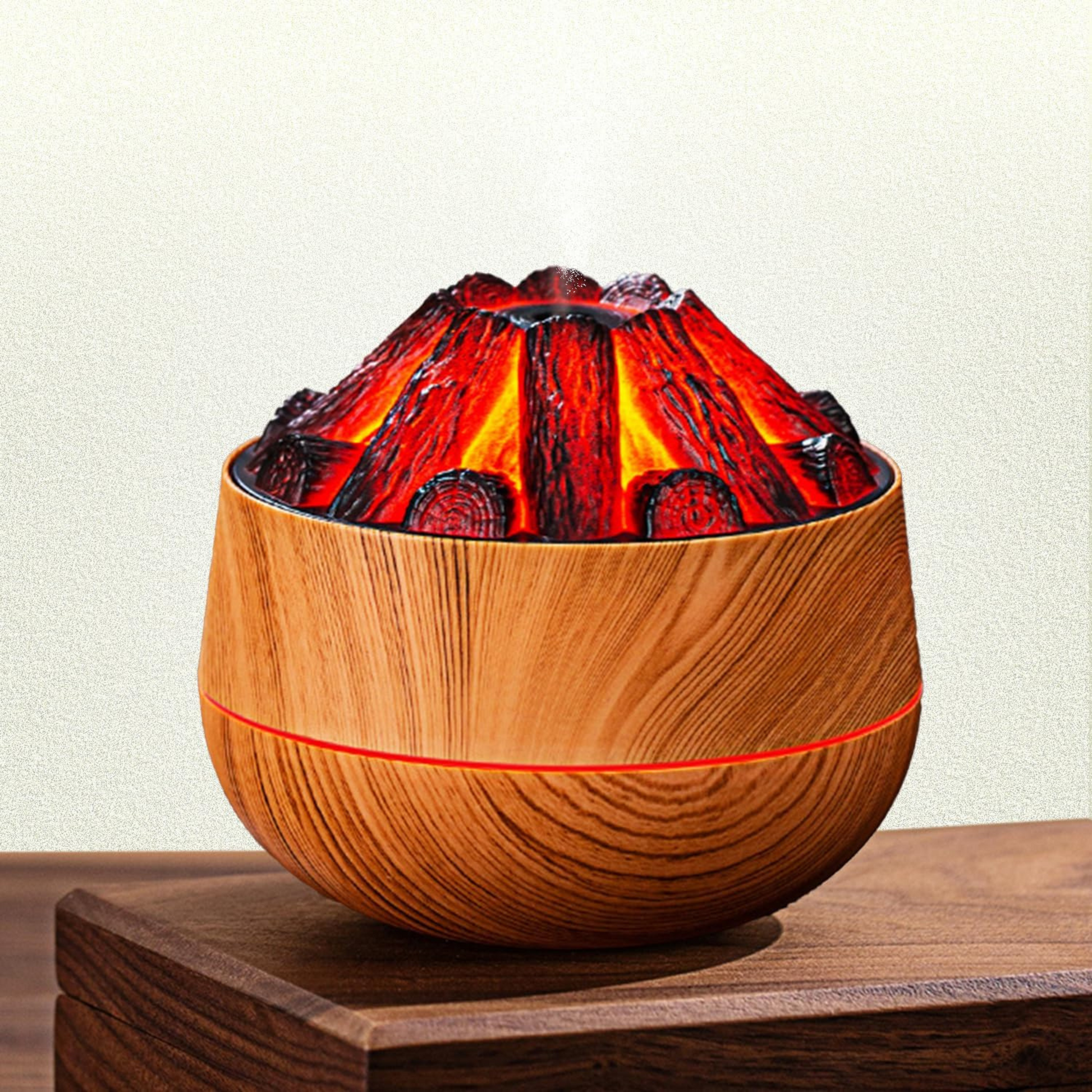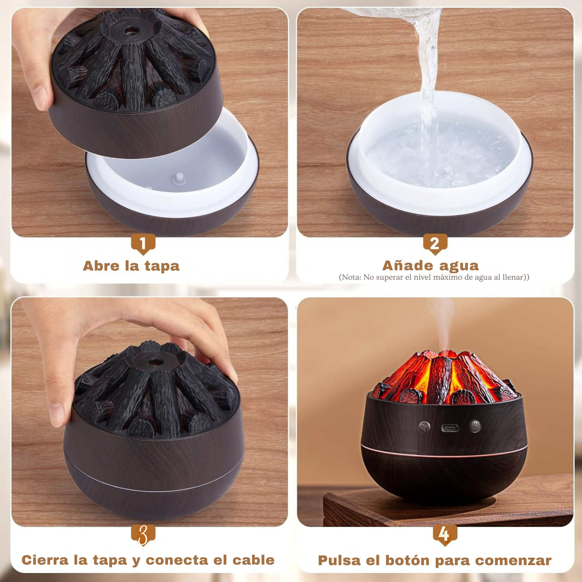 Humidificador con forma de volcán que alivia el estrés con vapor relajante, luz efecto fuego y funcionamiento silencioso.